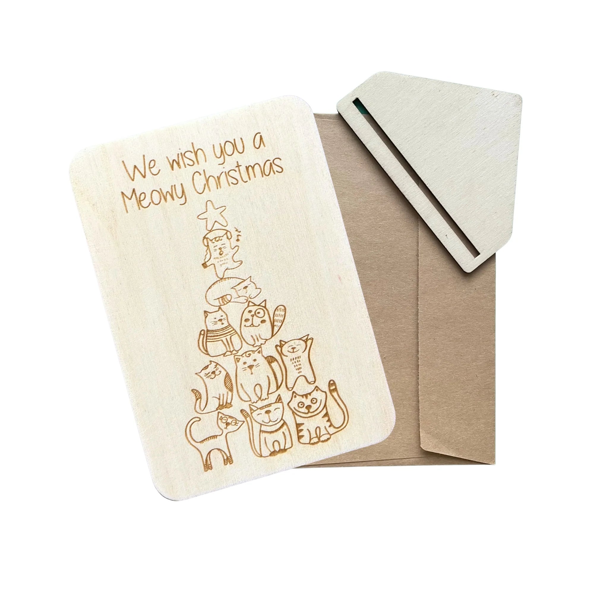 We wish you a Meowy Christmas. This delightful wooden greeting card is perfect for cat lovers and Christmas enthusiasts alike. Designed to stay on display, not tucked away, it’s a heartfelt and sustainable way to spread festive cheer.