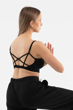 Update your workout staples with our cotton sports bra. Our yoga bra offers a high neckline for extra coverage and an eye catching back detail. Constructed from organic cotton, this fitness bra offers medium support, ideal Yoga, Pilates and Boxing.  Pair our organic cotton yoga bra with our organic cotton leggings. Available in Black and White.