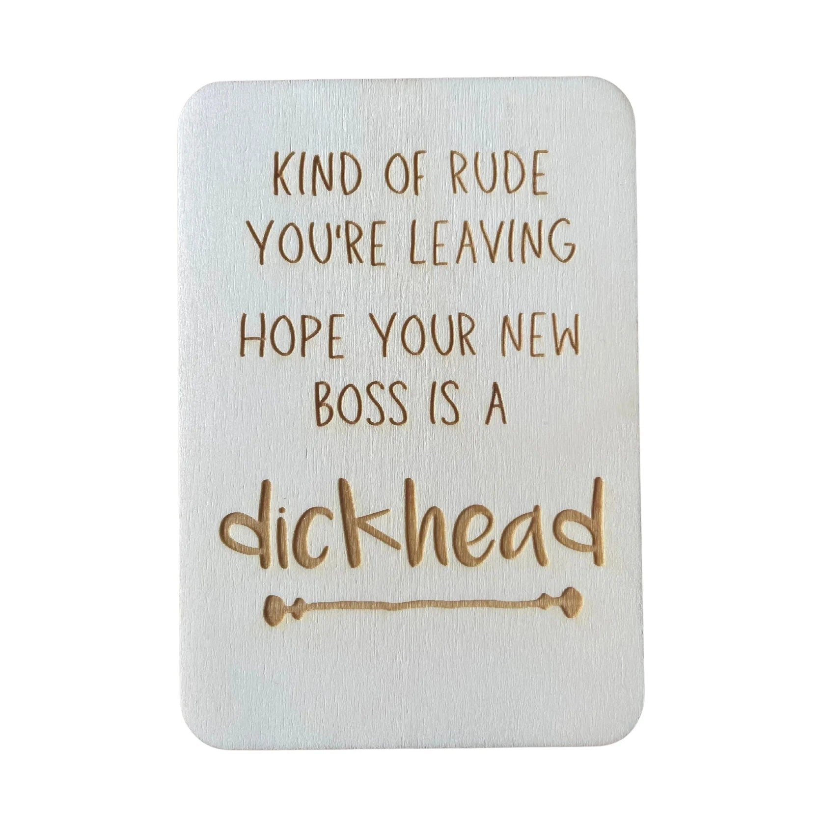 Kind of Rude you're leaving. Hope your new boss is a dickhead. Make someone's day extra special with our Ply Wood Card. Each card is a masterpiece of creativity and sentiment, designed to convey your warmest wishes on their special day.