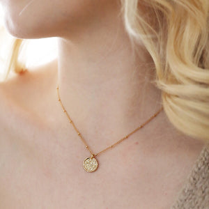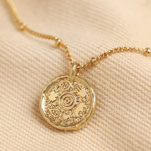 Made of 14ct gold plated brass, this necklace consists of a delicate satellite chain suspending a small round pendant in an organic, textured finish. The pendant features six tiny lucky symbols on the surface - a Hamsa hand, a wishbone, a four-leaf clover, an elephant, a heart, and a horseshoe, making it perfect for those who tend to be a little superstitious.