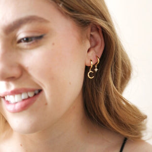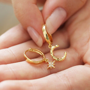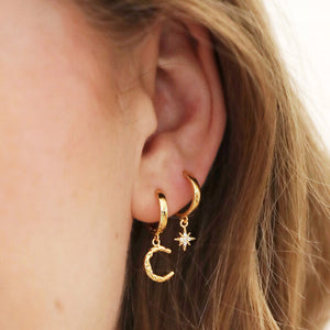 Made from 14ct gold plated brass, these dainty hoops are the perfect size for pairing with other simple studs and hoops to achieve a curated look. One hoop suspends a tiny star charm studded with clear crystals, and the other suspends a larger, hammered charm in the shape of a crescent moon.