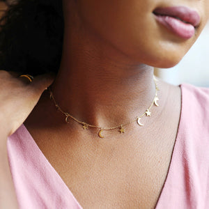 This timeless necklace showcases delicate moon and star charms. The necklace  is fastens with a lobster clasp and can be worn at two different lengths. Wear it as a symbol of guidance and inspiration.