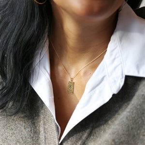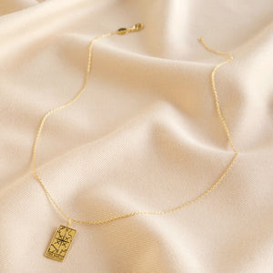 The world is at your feet. New opportunities and adventures await you. Introducing our Tarot Necklace, a mindfully crafted piece that blends mystique and elegance. The pendant showcases a beautifully detailed tarot card, perfect for those seeking a touch of spiritual insight and personal style. Wear it as a symbol of guidance and inspiration. Crafted with timeless elegance, this piece is features a matte finish and is plated with 18kt gold.