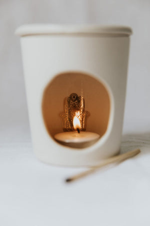 Enhance your ritual with our Hamsa Hand Ceramic Oil Burner, a mindful tool designed to bring protection and amplify self-love. Crafted from fine porcelain, this 'self-love' dish allows you to burn your favourite essential oils, enveloping your space in soothing aromas. As the candle's light illuminates the gold Hamsa hand, embrace the symbol of protection and good fortune, fostering a serene and loving environment.