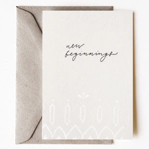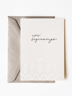 Celebrate fresh starts and meaningful moments with our New Beginnings Greeting Card. Each card is hand block printed, making every piece truly one of a kind. Printed using traditional letterpress techniques and paired with a 100% post-consumer recycled envelope, this card blends artistry with sustainability.