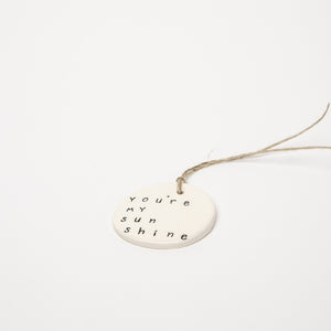 This ceramic tag is made from earthenware clay and features the wording You're my Sunshine. It is fired twice and complete with a glossy glaze.