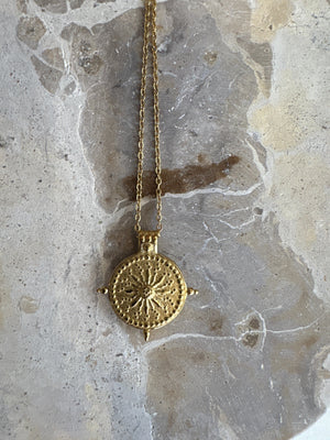 Crafted from durable stainless steel with a radiant golden finish, this timeless necklace is designed to last. The detailed sun motif embodies guidance, energy and inner strength, making it a meaningful piece for your daily rituals or a thoughtful gift for someone special.