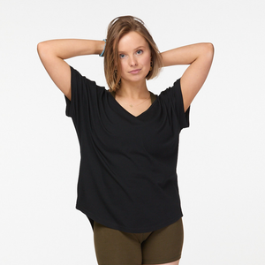 Introducing our Women's Organic Cotton V-Neck T-Shirt. This slouchy, boxy tee is a timeless and versatile wardrobe staple, designed to effortlessly transition from studio to street.