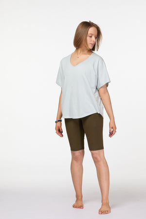 Introducing our Women's Organic Cotton V-Neck T-Shirt. This slouchy, boxy tee is a timeless and versatile wardrobe staple, designed to effortlessly transition from studio to street.