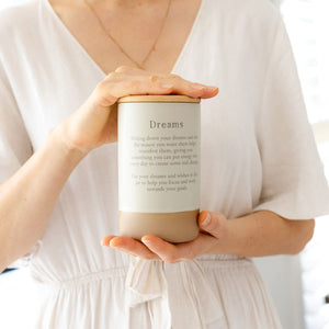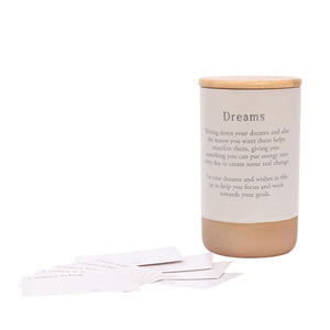 Our Dreams Jar invites you to slow down reflect and nurture the visions that inspire you. Writing down your dreams helps you bring them to life and gives you something meaningful to focus on each day. This beautifully crafted ceramic jar includes thirty double sided notecards so you can record your wishes intentions and the reasons behind them. A gentle daily practice that helps you move closer to the goals that matter.