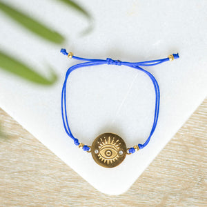 Featuring a vibrant adjustable cord and a polished gold charm engraved with the protective eye design, this bracelet makes a thoughtful gift for loved ones or a meaningful addition to your own mindful jewellery collection.