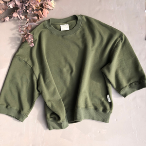 Natural tones, mindful comfort. The Luna Jumper in khaki is crafted from soft, breathable organic cotton — milled and made in Australia with care. Its oversized shape, cropped sleeves and soft neckline make it an easy everyday favourite.